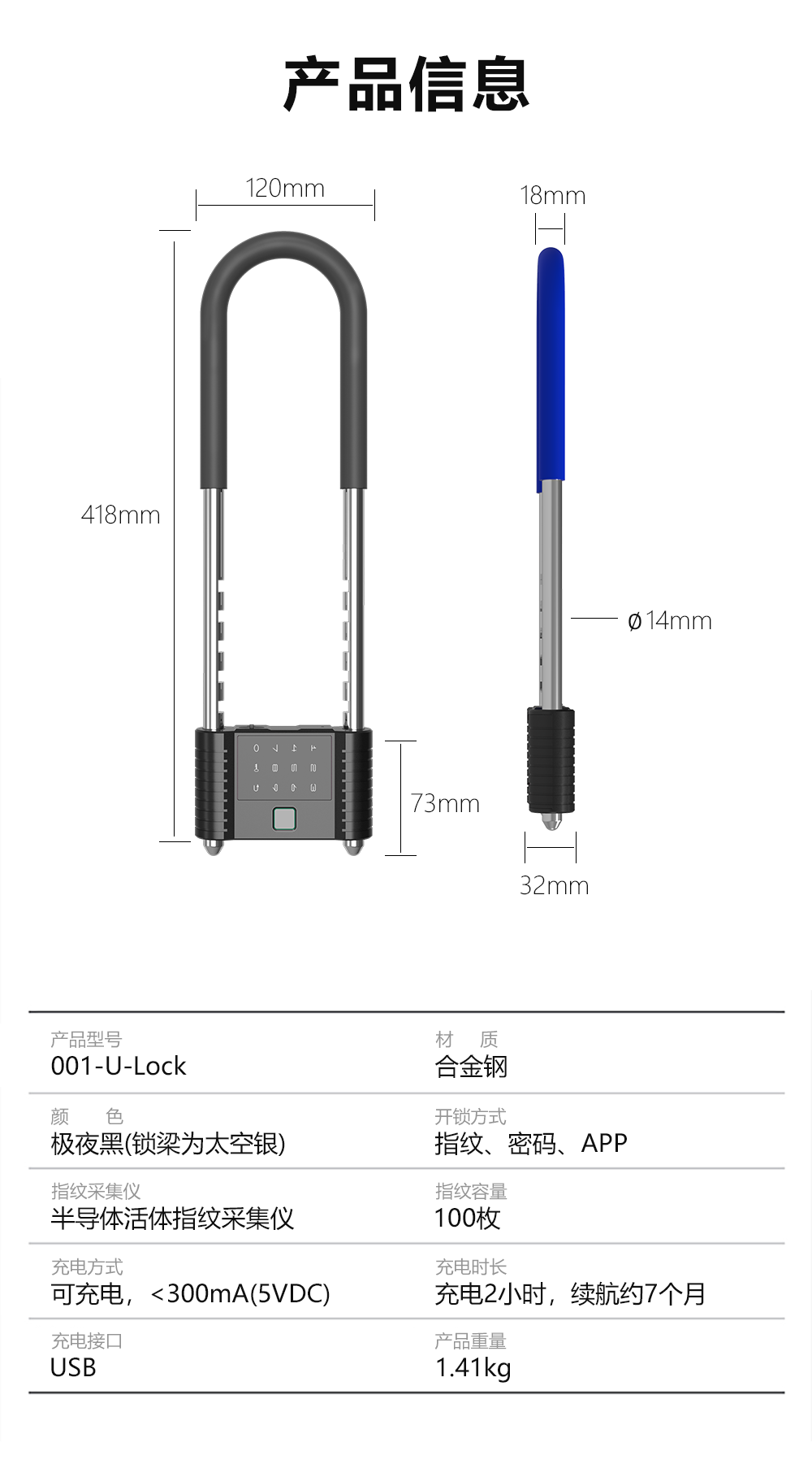 歐米智能U型鎖防盜液壓抗剪,無需鑰匙開鎖,手機(jī)APP,密碼指紋輕松解鎖,設(shè)備可共享給身邊的親朋好友,并且權(quán)限可以隨時(shí)收回,一把鎖可供好幾人一起使用,手機(jī)APP上會(huì)有U型鎖電量顯示,電量不足時(shí)會(huì)發(fā)出提示,產(chǎn)品在開鎖時(shí)會(huì)生產(chǎn)開鎖記錄,隨時(shí)隨地了解鎖在什么時(shí)間打開,產(chǎn)品具有IP66的防護(hù)等級(jí),即使是在下雨天氣也能使用,智能U型鎖采用USB接口充電,充一次電可使用180天(按照一天開鎖一次來算)。
